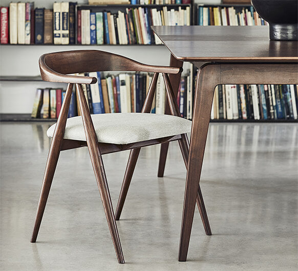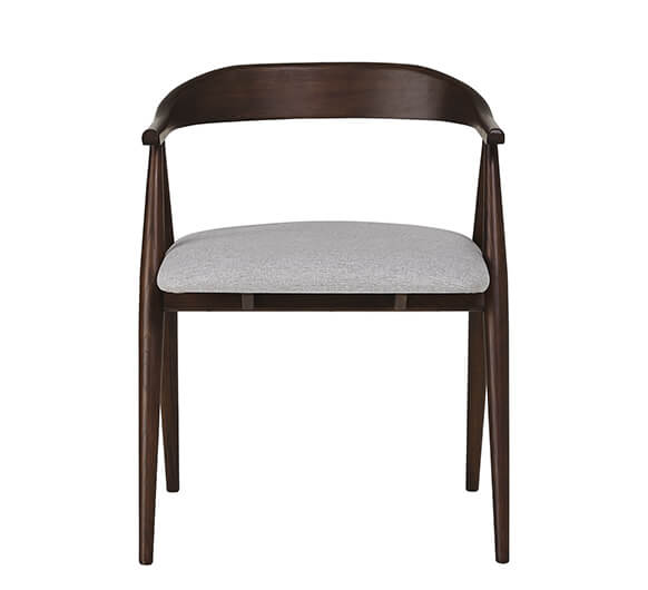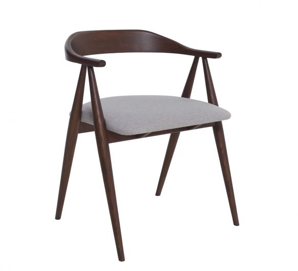 Featuring a smooth, curved back, this armchair is a reflection of Nordic mid-century design. Including a pale fabric, to compliment the rich dark tone of the wood.