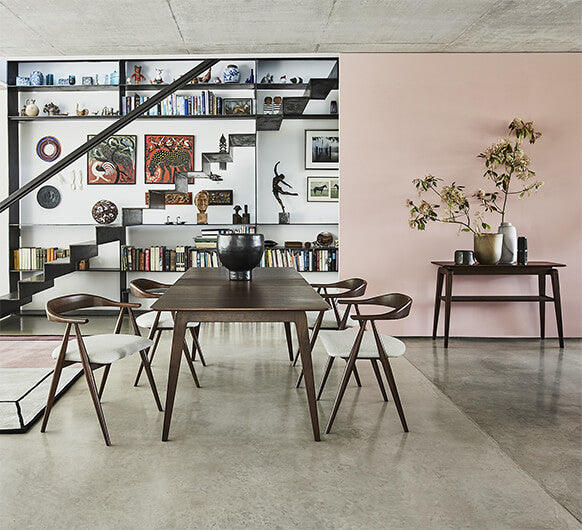 A stylish extending table, with tapered legs and visible tenon joints. Designed to seat 6 but can be extended to fit 8 by using the reciprocating mechanism - the extension fitting nicely within the table for a sleek contemporary design.